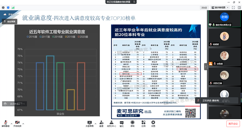 为确保2021级计算机类学生专业分流工作顺利进行,促进学生充分了解软件工程专业,减少学生在专业选择中的盲目性,软件工程教研室于4月9日晚上召开线上专业介绍讲座。计算机系主任崔炳德、软件工程教研室全体教师、2021级计算机类全体学生参加了本次讲座。