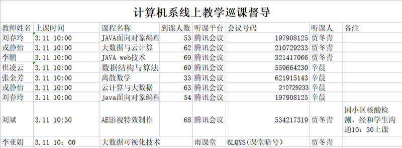 为充分保障线上教学质量,确保学生在线学习与线下课堂“等质同效”,计算机系精心组织,科学应对,主动作为,积极开展线上教学督导工作,及时掌握线上教学基本情况。